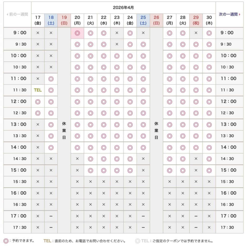 ご予約 2026.04.032026.04.18 RESERVATIONご予約 🖥 オンライン予約 ホットペッパービューティーで予約する ※予約一覧(例) 24時間いつでも、ご予約頂けます。 ☎️ お電話でのご予約 TEL:0964-32-0601 (当日予約のみ承ります) 受付時間:10:00〜 (当日中) オンライン予約画面が満席でも、あきらめないで! 一度お電話ください。施術出来る場合もあります。 🔔(当日予約のみ対応) TEL : 0964-32-0601